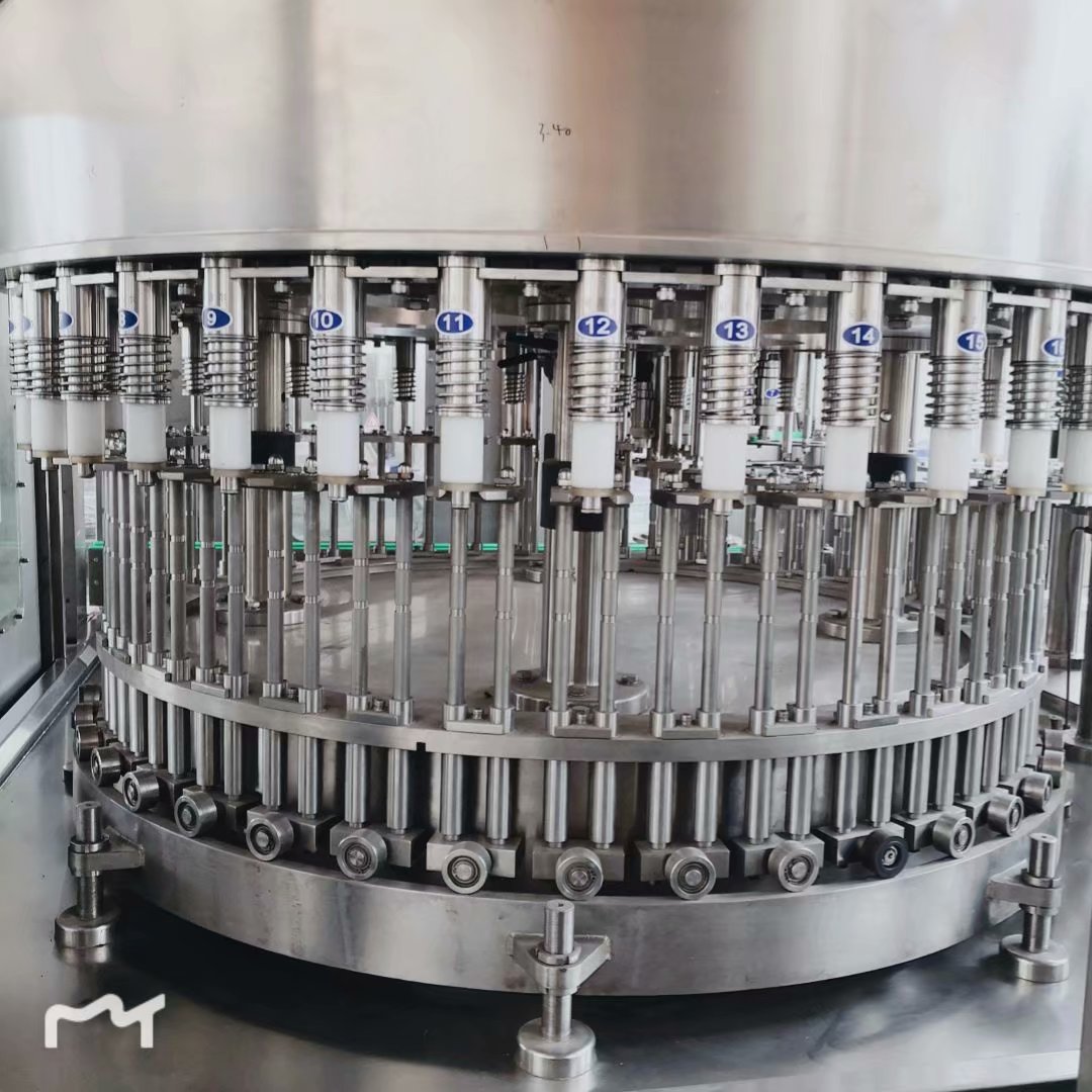 The water filling machine is mainly used in the beverage filling operations. The three functions of bottle wash, fill and seal are composed in one body of the machine. The whole process is automatic. The machine is used in filling juices, mineral water and purified water in bottles made of polyester and plastics. The machine can also be used in hot filling if being installed with temperature controlling device. The handle of the machine can be freely and conveniently turned to adjust the machine to fill various types of bottles. The filling operation is faster and more stable because the micro pressure filling operation of the new type is adopted.